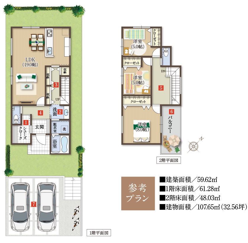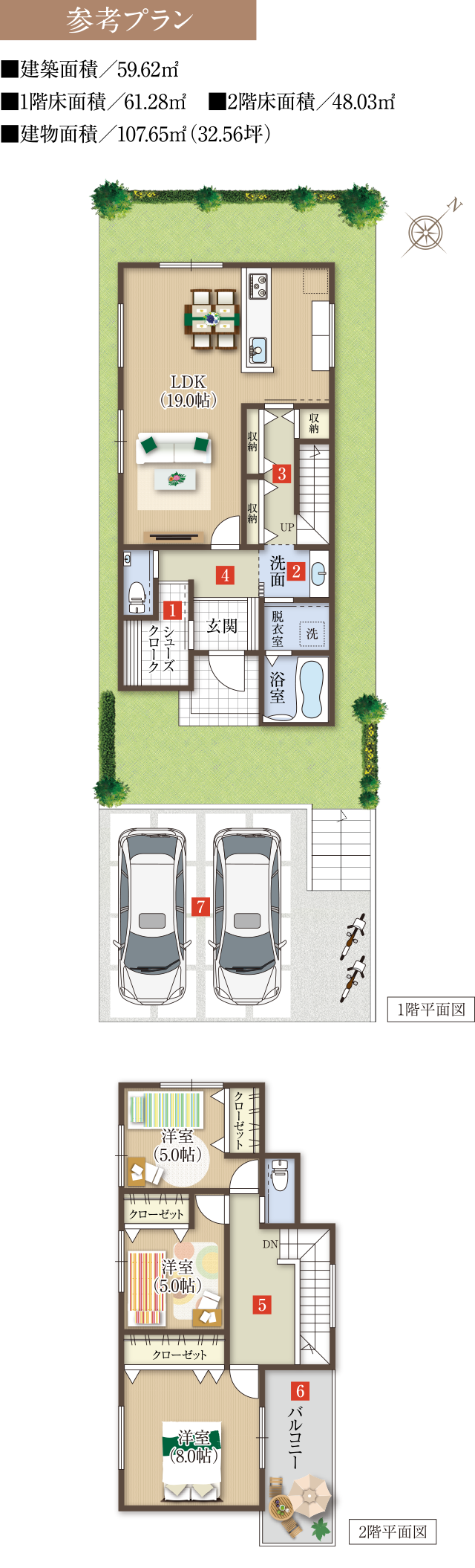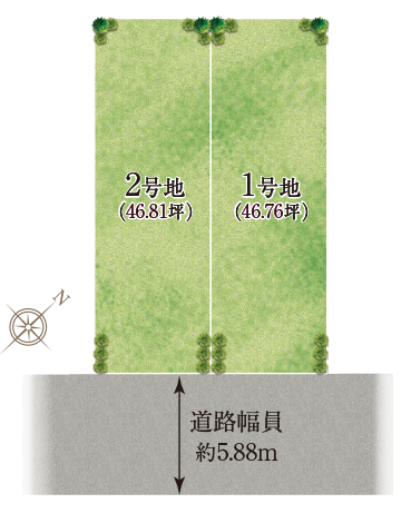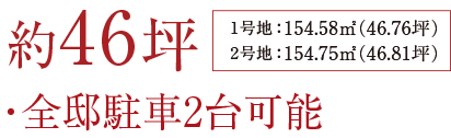 | 土地面積 | 1号地:154.58㎡(46.76坪)~ 2号地:154.75㎡(46.81坪) |